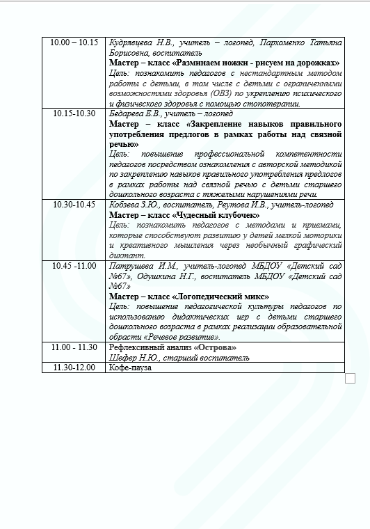 Запланировано проведение мастер-классов по стопотерапии, логопедии и другим направлениям решения задач образовательной области «Речевое развитие». ПЕдагоги детского сада проведут образовательный экскурс по учреждению. Также на мероприятии будет работать выставка авторских методических пособий для организации коррекционно-развивающей работы в группах компенсирующей направленности.
