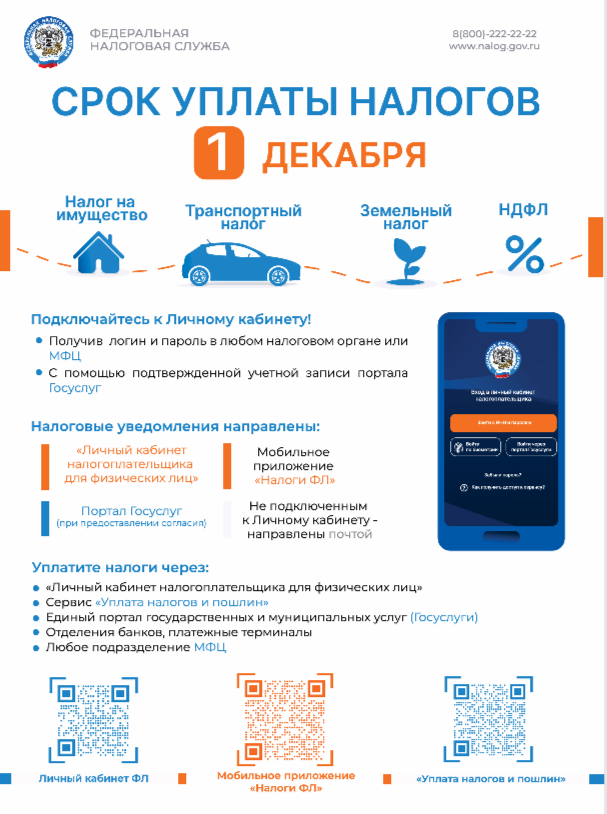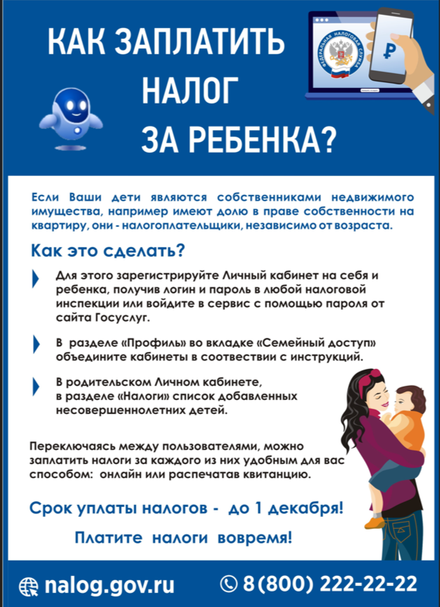 14.10.2025Уважаемые посетители нашего сайта!Федеральная налоговая служба напоминает о важности соблюдения сроков уплаты налогов. Не забудьте, что крайний срок для уплаты налогов – до 1 декабря!Если вы хотите узнать, как правильно заплатить налог за ребенка, рекомендуем ознакомиться с полезной информацией, которая поможет вам в этом вопросе.Давайте будем ответственными и избегать неприятностей!