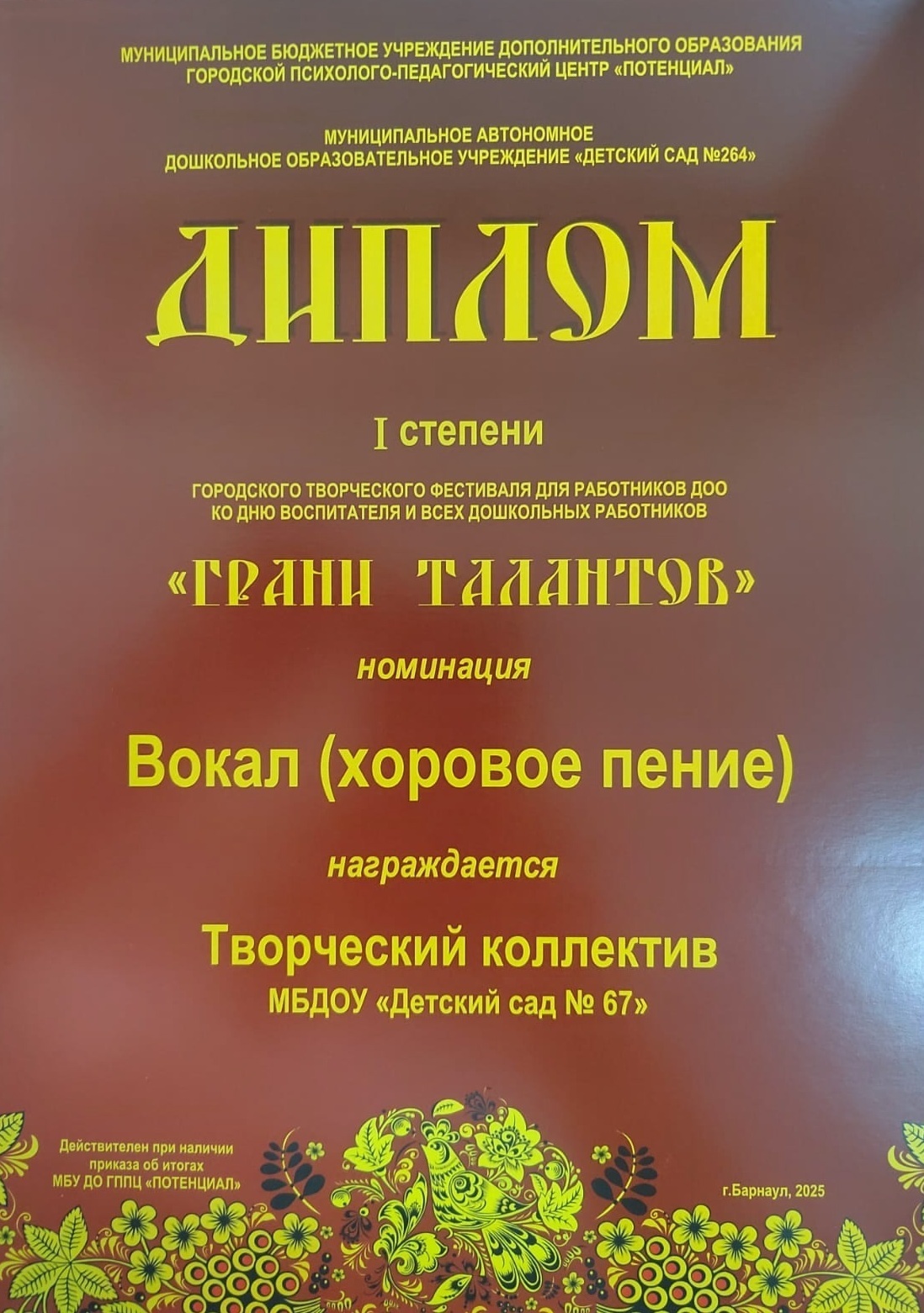 30.09.2025В преддверии Дня воспитателя и всех дошкольных работников, мы стали участниками яркого и запоминающегося события – финального этапа, впервые организованного, творческого фестиваля «Грани таланта», посвященного дошкольным работникам, который прошел в МБДОУ «Детский сад №264».